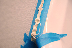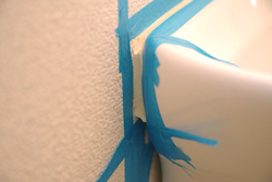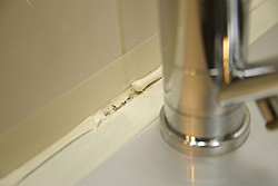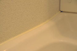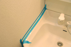 コーキング工賃の大半が人件費ですので、できるだけ多くの箇所をコーキング交換処理をしてもらうほうが結局は安く済みます。 黄ばんだ箇所・カビが発生している箇所だけすると、新しいコーキングと古いコーキングの色の差が出てなんとなく変な感じですし、どうでなら一気にリフレッシュしたほうが有利ですので、数千円をケチらず補修すべき箇所は補修しましょう。 今回はキッチンの1部だけでしたので、DIYでコーキング処理を行ってみました。 [コーキングの仕方] 用意するのは防カビ剤が入ってるコーキング剤(白)とマスキングテープの2つ ![]() よりによって混合栓の裏側、一番目立つようにカビが生えてます(T_T) 自己主張強いカビです。 ![]() まずは養生、マスキングテープを気持ち(ほんの気持ち)程度ですが、古いコーキングより外側に貼り付けます。 約0.5mm~1mmほど広めにしましょう。(とか言いますが結構アバウトです) ![]() そこに、どべーーーーっと! コーキングを塗りつけます。 ![]() コーキングを塗ったあとは、人差し指でこのコーキング剤をならすのですが、その際指先を少しぬらします。すると滑らかに伸ばし塗りできます。 ![]() あとは、直ぐにマスキングテープを剥がします。 その際はゆっくり丁寧にはがしてくださいね。 一気にはがしたりするとコーキングの端が汚れたり、テープが途中で切れてコーキングに当たりキズが付いたりしてしまう可能性があります。 ![]() これで完成しましたが、とても簡単ですね。 塗り替えすると物凄く綺麗になります、色も鮮やかな白色ですのですが、逆に他の古いコーキングが目立ちます。 簡単なのでそっちも塗り替えましょう(^_^;) お客様のためです。 洗面所も同じ手順で行います。 今回はマスキングの様子がわかるように青のテープを使いました。 シャンドレの洗面ボール部分はコーキング剤が厚めに塗られていることが多いので、予めカッターなどで古いコーキングを切り落として肉を落としておくといいです。 ![]() マスキングの全貌はこんな感じです。 ![]() 洗面ボール部分は狭くてやりにくいので、マスキングを広範囲にしておくといいです。 指についたコーキングをボールや壁に誤ってつけてしまうんですよね。 ![]() 洗面ボール部分は肉落とししているので、少し大目に盛塗ります。