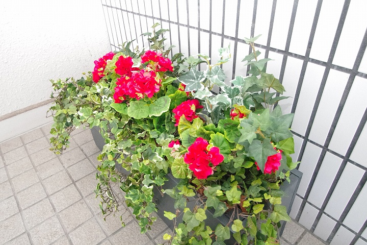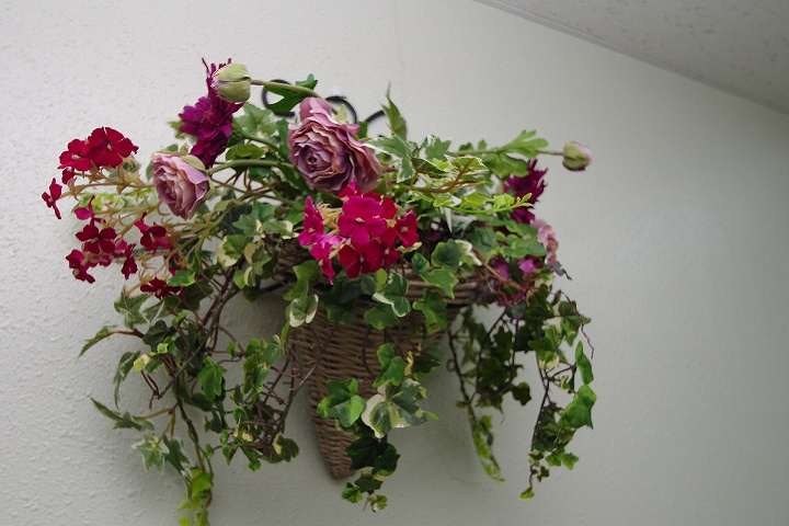 寒々とした共用部にハンキングバスケットにフラワーアレンジして壁面を彩ります。